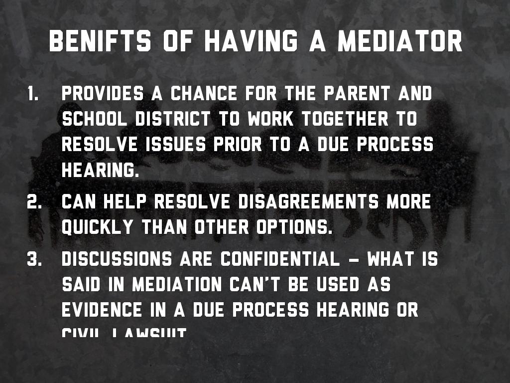 Mediation: Available at any time, even if a due process complaint/hearing request or written state complaint has already been filed.