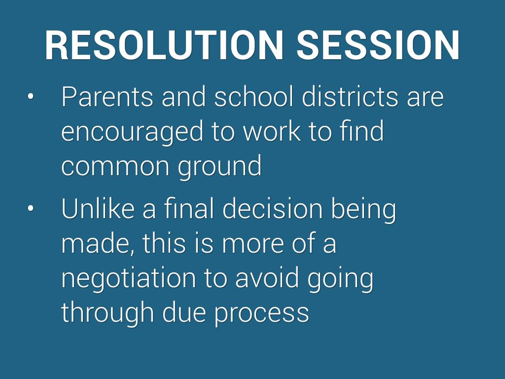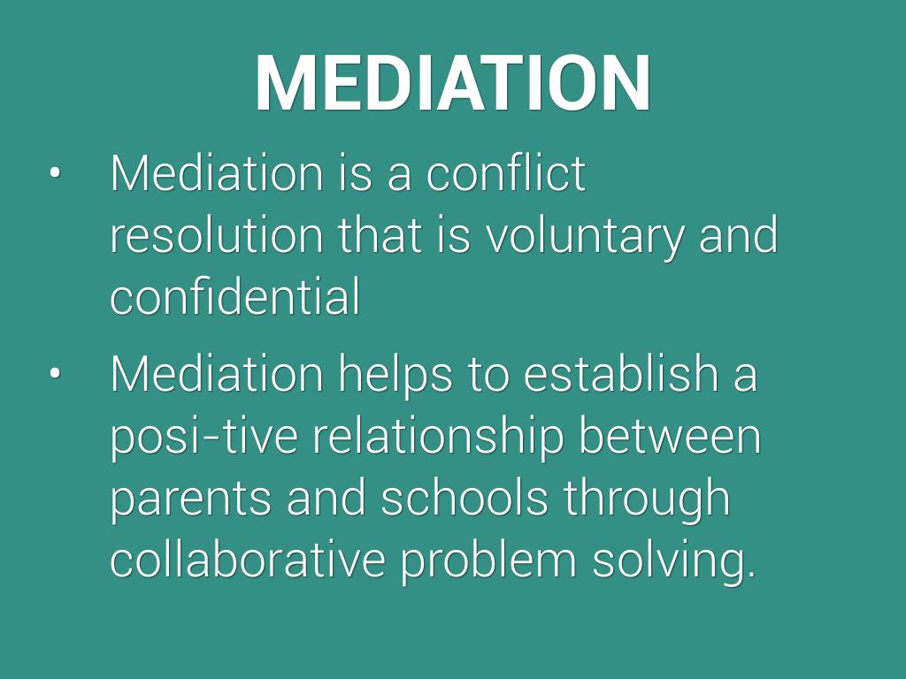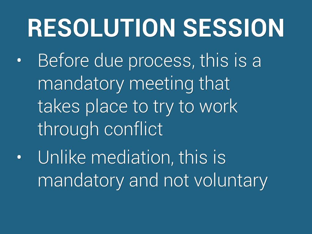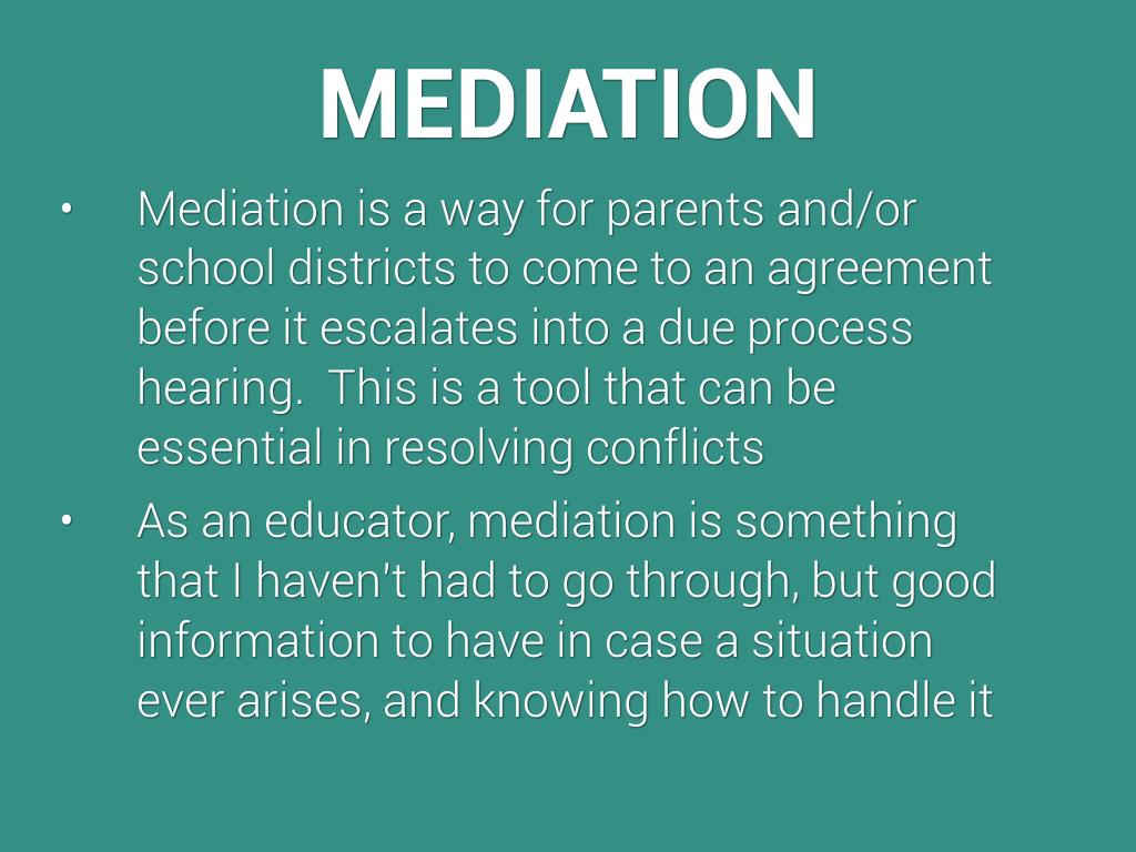 Mediation is a way for parents and/or school districts to come to an agreement before it escalates into a due process hearing. This is a tool that can be essential in resolving conflicts
