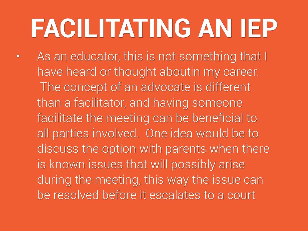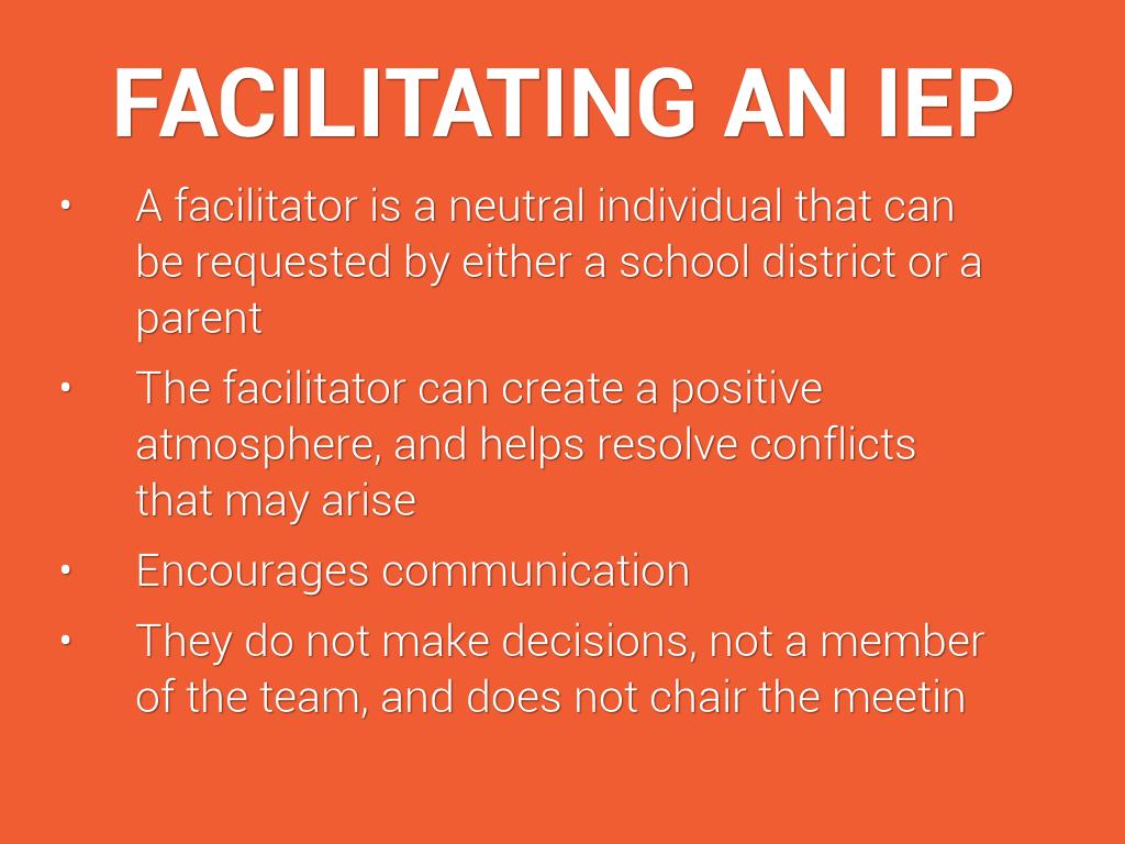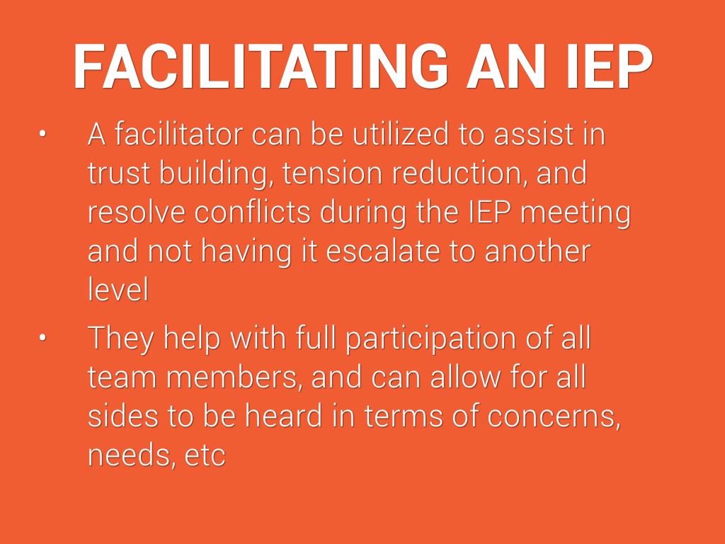 A facilitator can be utilized to assist in trust building, tension reduction, and resolve conflicts during the IEP meeting and not having it escalate to another level