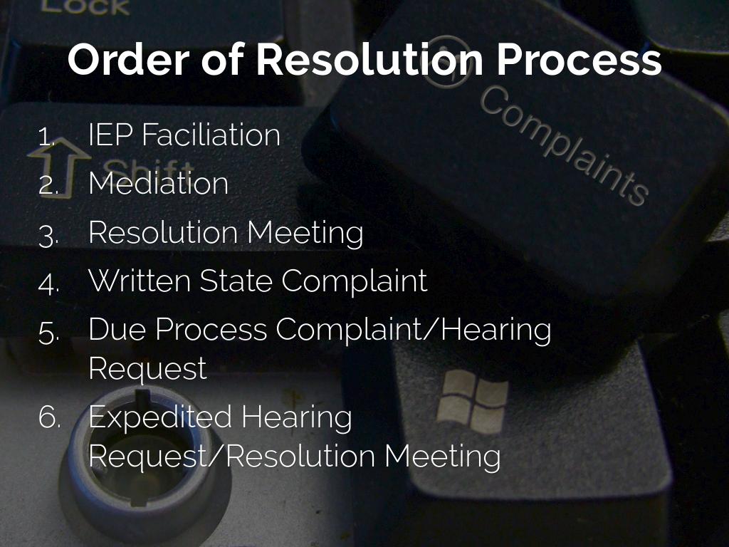 IEP Faciliation, Mediation, and Resolution Meeting are all forms of negotiation before a complaint goes to Due Process.