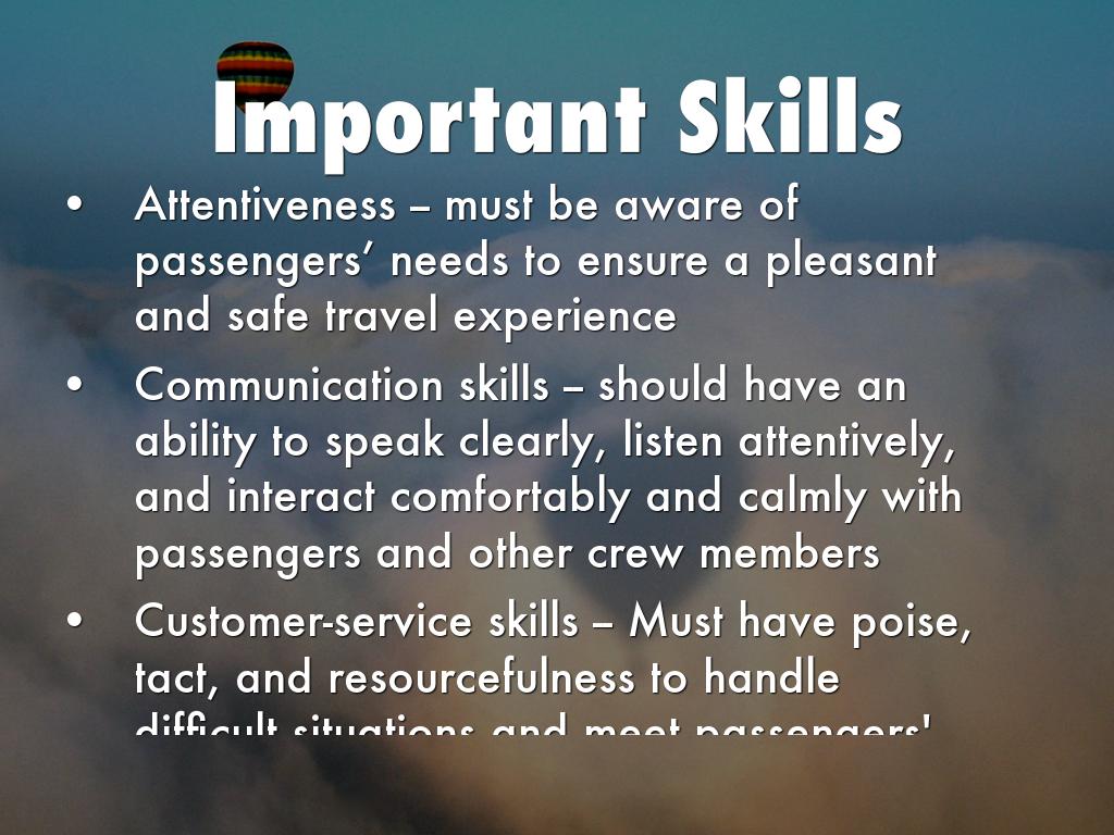 Communication skills -- should have an ability to speak clearly, listen attentively, and interact comfortably and calmly with passengers and other crew members