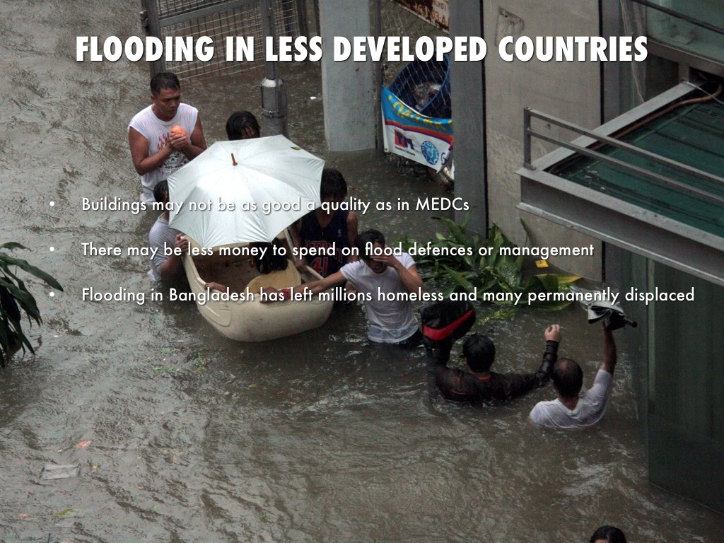 Flooding in many less developed countries can have much more serious implications as buildings may not be constructed to as good a quality as in more developed countries , and there may be less money to spend on flood defences or management. Flooding in areas like Bangladesh has left millions homeless and many permanently displaced , but coastal areas around the world will also be at risk as sea levels rise.
