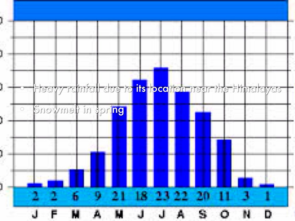 In the spring, the snow in the Himalayas melts and there is a sudden increase in the amount of water in the river channel which can overspill and flood the land.