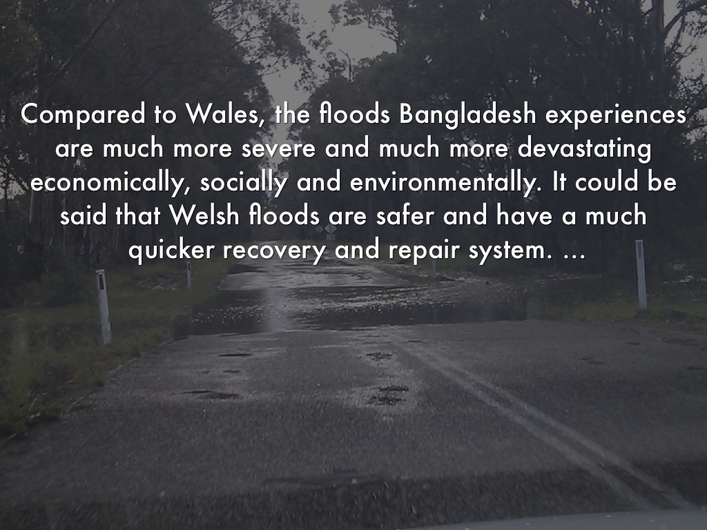 Compared to Wales, the floods Bangladesh experiences are much more severe and much more devastating economically, socially and environmentally. It could be said that Welsh floods are safer and have a much quicker recovery and repair system.
