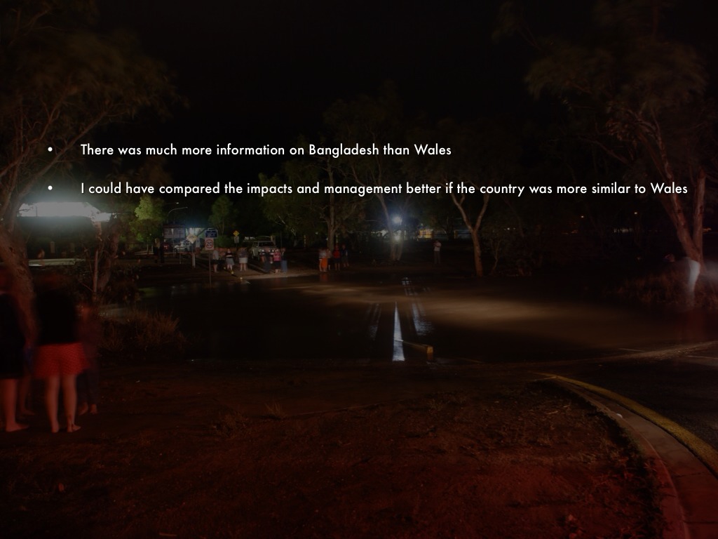 I found that there was huge amount if information on flooding in Bangladesh but not very much information about Wales' flooding. Perhaps my investigation could have been improved by comparing Wales to a country that differs from Wales less I could draw better comparisons. I could have compared Wales to another rich, developed country such as another MEDC.