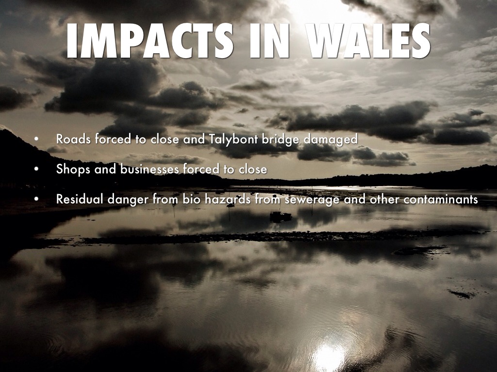 During flooding in 2012, 1000 people had to be evacuated from mid Wales, many of these were from holiday parks, and 150 people had to be rescued. Roads were forced to close and a bridge in Talybont was damaged. Flooding in fields damaged crops which had economic repercussions. Last year, shops in. Cardiff were forced to close due to flash flooding. Villages in Ceredigion were flooded by 5 ft of water and there were high river levels in Aberystwyth and residual danger from bio hazards from sewerage and other contaminants that could have entered the water.