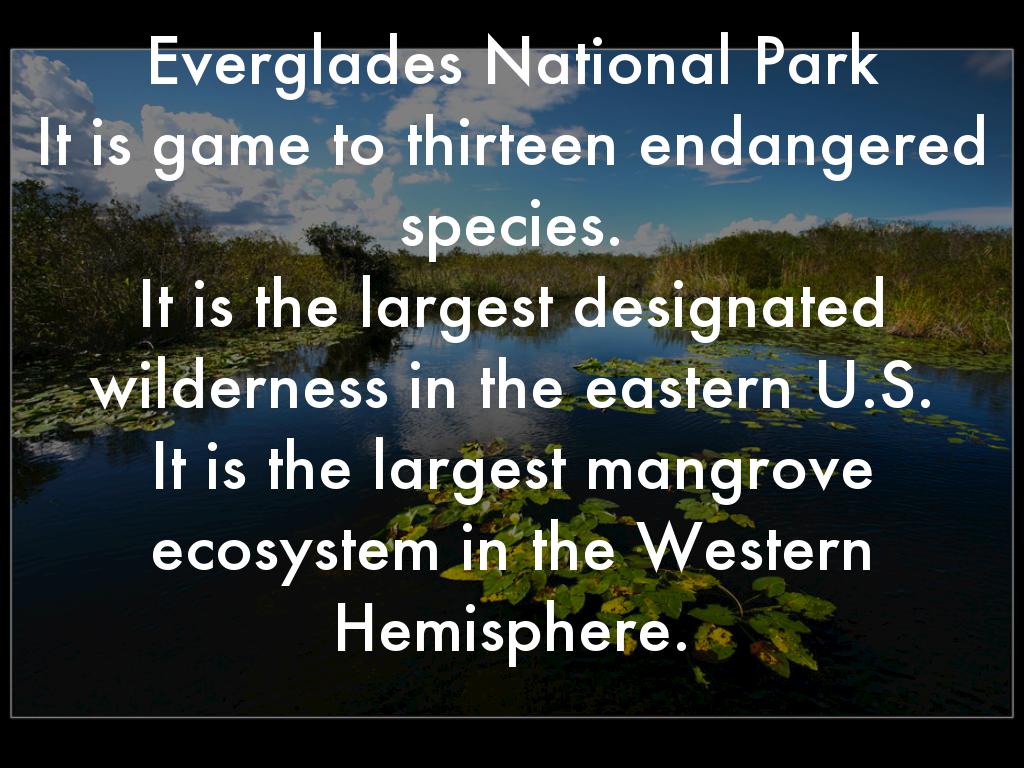 Everglades National Park It is game to thirteen endangered species. It is the largest designated wilderness in the eastern U.S. It is the largest mangrove ecosystem in the Western Hemisphere.