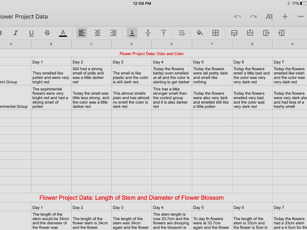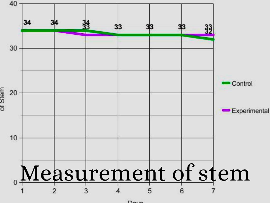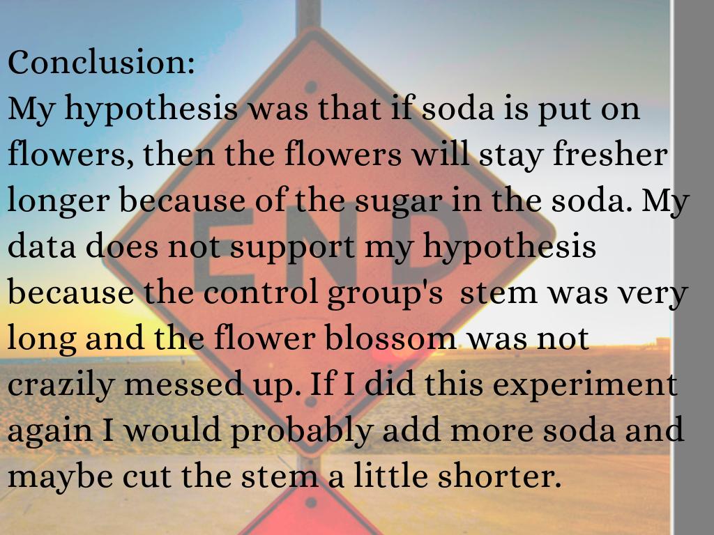My hypothesis was that if soda is put on flowers, then the flowers will stay fresher longer because of the sugar in the soda. My data does not support my hypothesis because the control group's stem was very long and the flower blossom was not crazily messed up. If I did this experiment again I would probably add more soda and maybe cut the stem a little shorter.