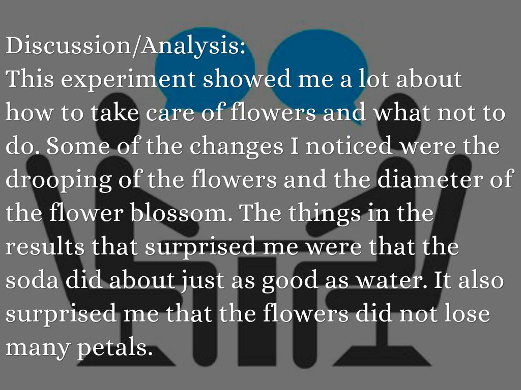 This experiment showed me a lot about how to take care of flowers and what not to do. Some of the changes I noticed were the drooping of the flowers and the diameter of the flower blossom. The things in the results that surprised me were that the soda did about just as good as water. It also surprised me that the flowers did not lose many petals.