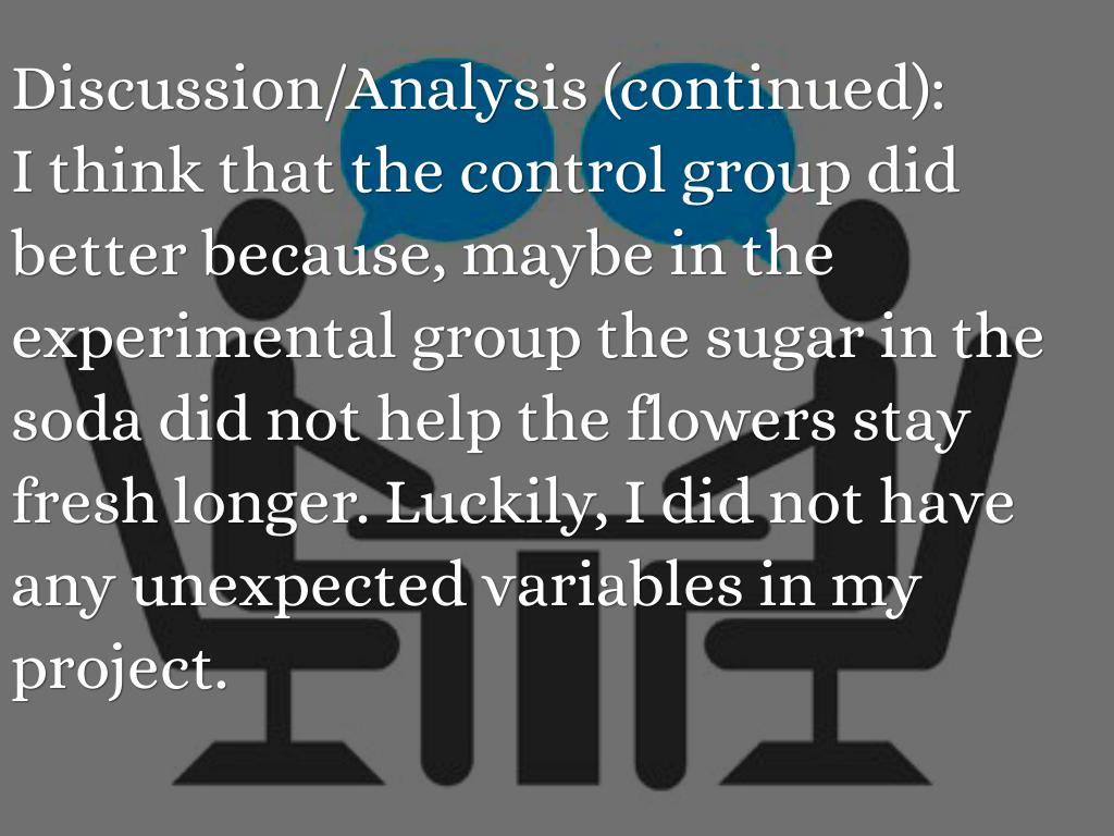 I think that the control group did better because, maybe in the experimental group the sugar in the soda did not help the flowers stay fresh longer. Luckily, I did not have any unexpected variables in my project.
