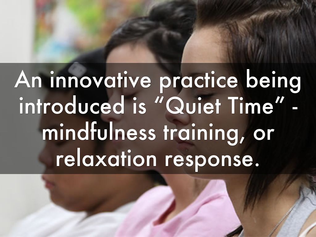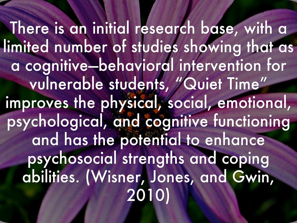 There is an initial research base, with a limited number of studies showing that as a cognitive—behavioral intervention for vulnerable students, “Quiet Time” improves the physical, social, emotional, psychological, and cognitive functioning and has the potential to enhance psychosocial strengths and coping abilities. (Wisner, Jones, and Gwin, 2010)