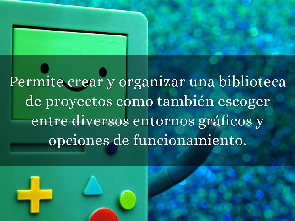 Permite crear y organizar una biblioteca de proyectos como también escoger entre diversos entornos gráficos y opciones de funcionamiento.