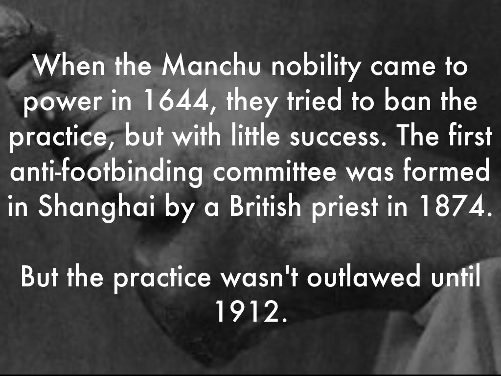 When the Manchu nobility came to power in 1644, they tried to ban the practice, but with little success. The first anti-footbinding committee was formed in Shanghai by a British priest in 1874.