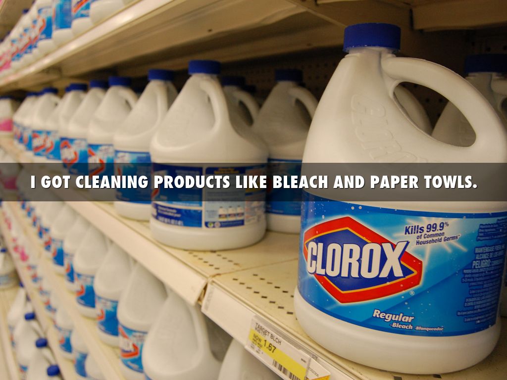 I GOT CLEANING PRODUCTS LIKE BLEACH AND PAPER TOWLS.
