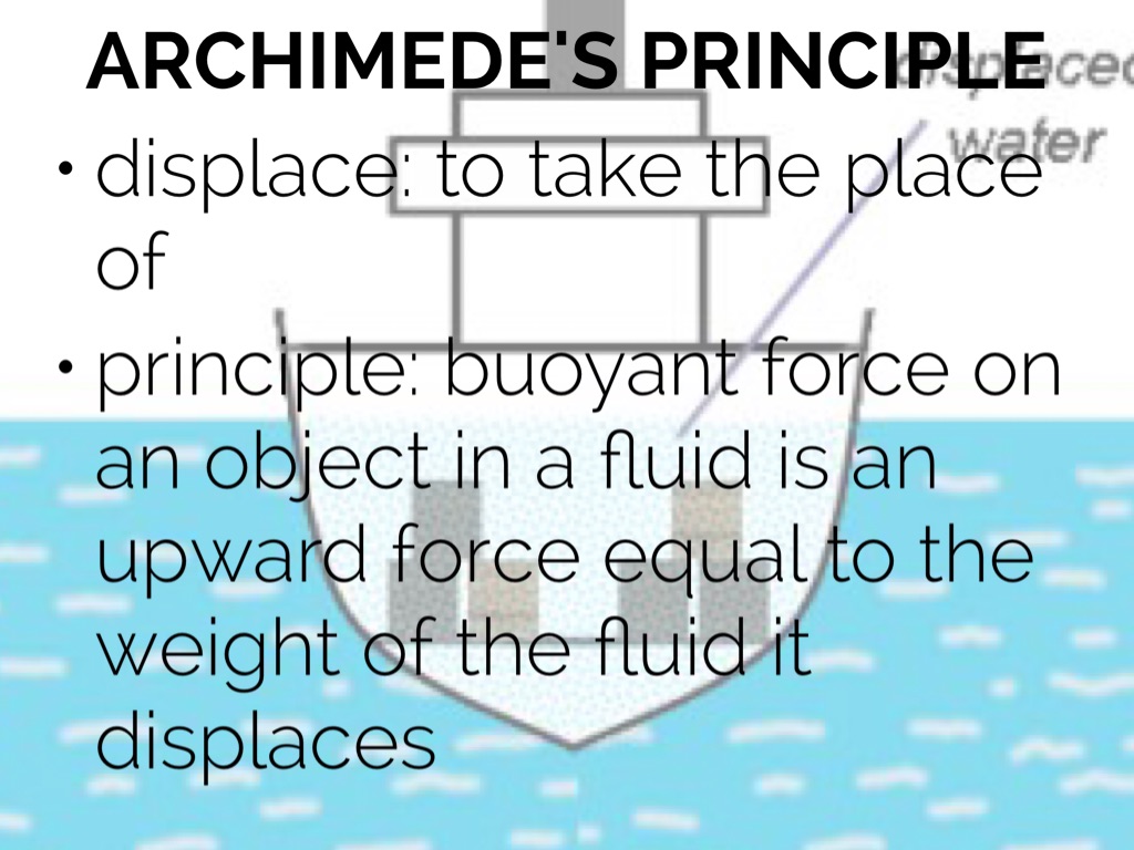 principle: buoyant force on an object in a fluid is an upward force equal to the weight of the fluid it displaces