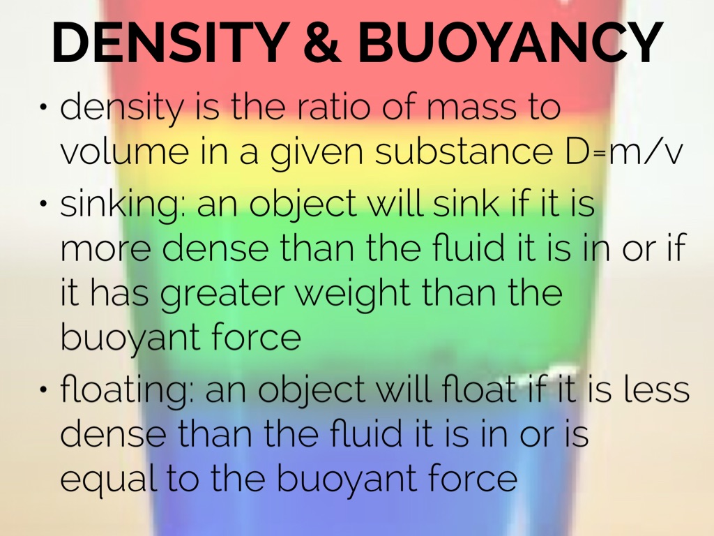 floating: an object will float if it is less dense than the fluid it is in or is equal to the buoyant force