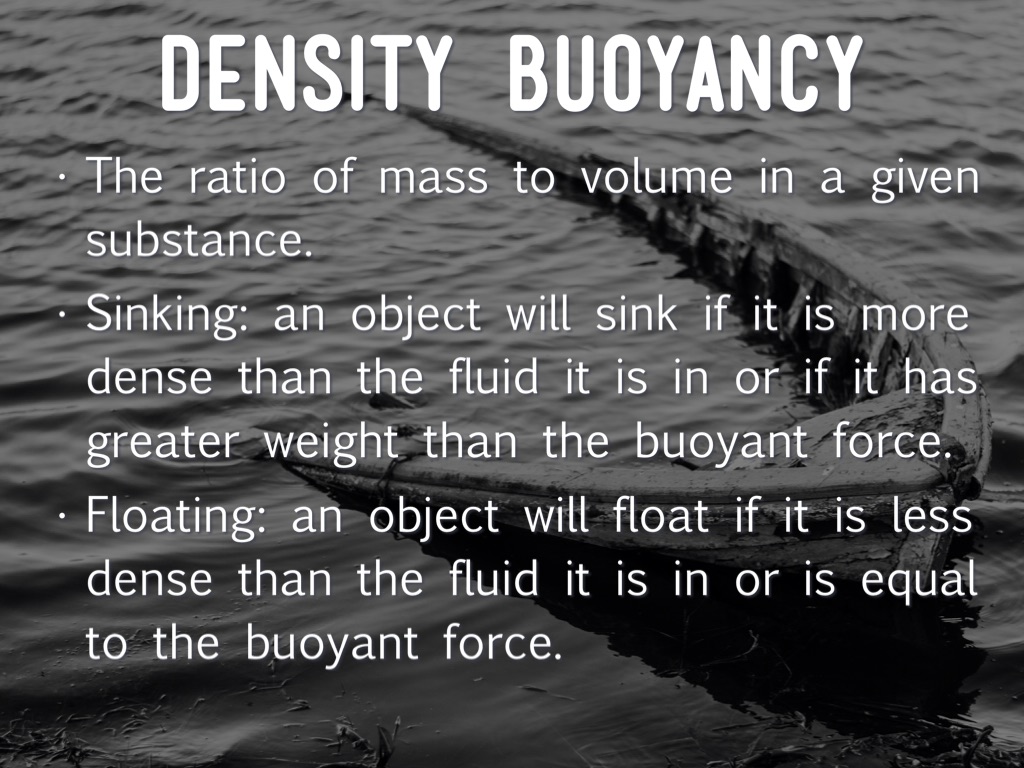 Sinking: an object will sink if it is more dense than the fluid it is in or if it has greater weight than the buoyant force.