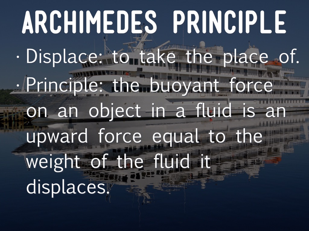 Principle: the buoyant force on an object in a fluid is an upward force equal to the weight of the fluid it displaces.