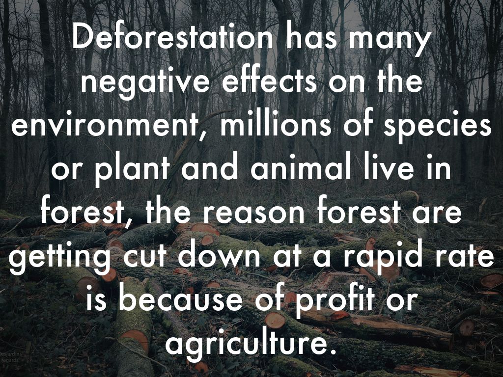 Deforestation has many negative effects on the environment, millions of species or plant and animal live in forest, the reason forest are getting cut down at a rapid rate is because of profit or agriculture.