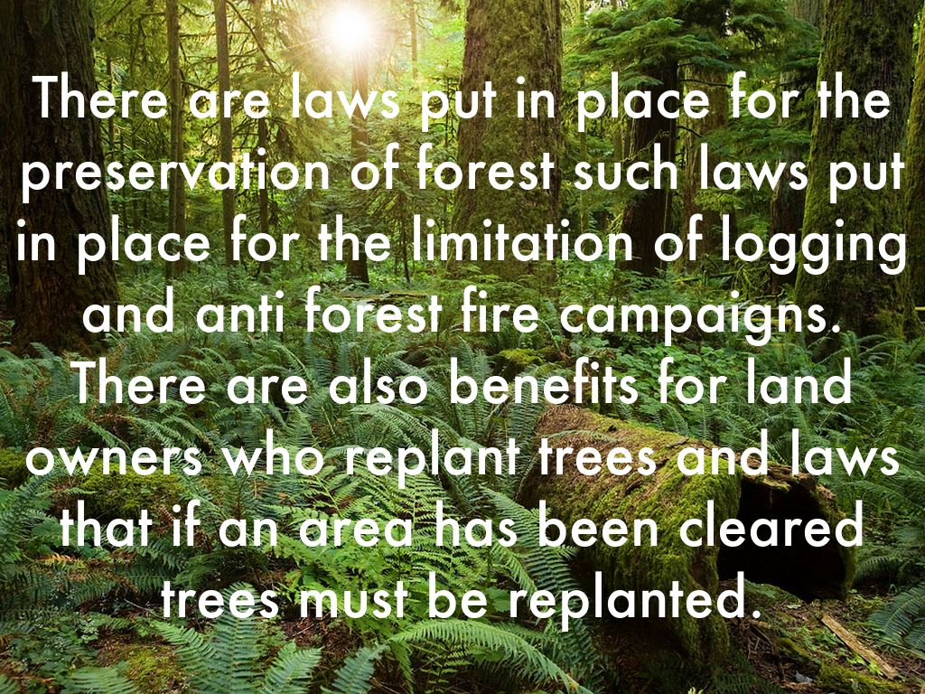 There are laws put in place for the preservation of forest such laws put in place for the limitation of logging and anti forest fire campaigns. There are also benefits for land owners who replant trees and laws that if an area has been cleared trees must be replanted.