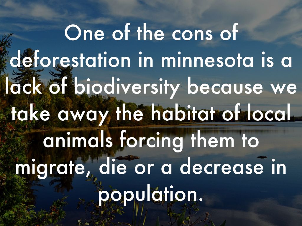 One of the cons of deforestation in minnesota is a lack of biodiversity because we take away the habitat of local animals forcing them to migrate, die or a decrease in population.