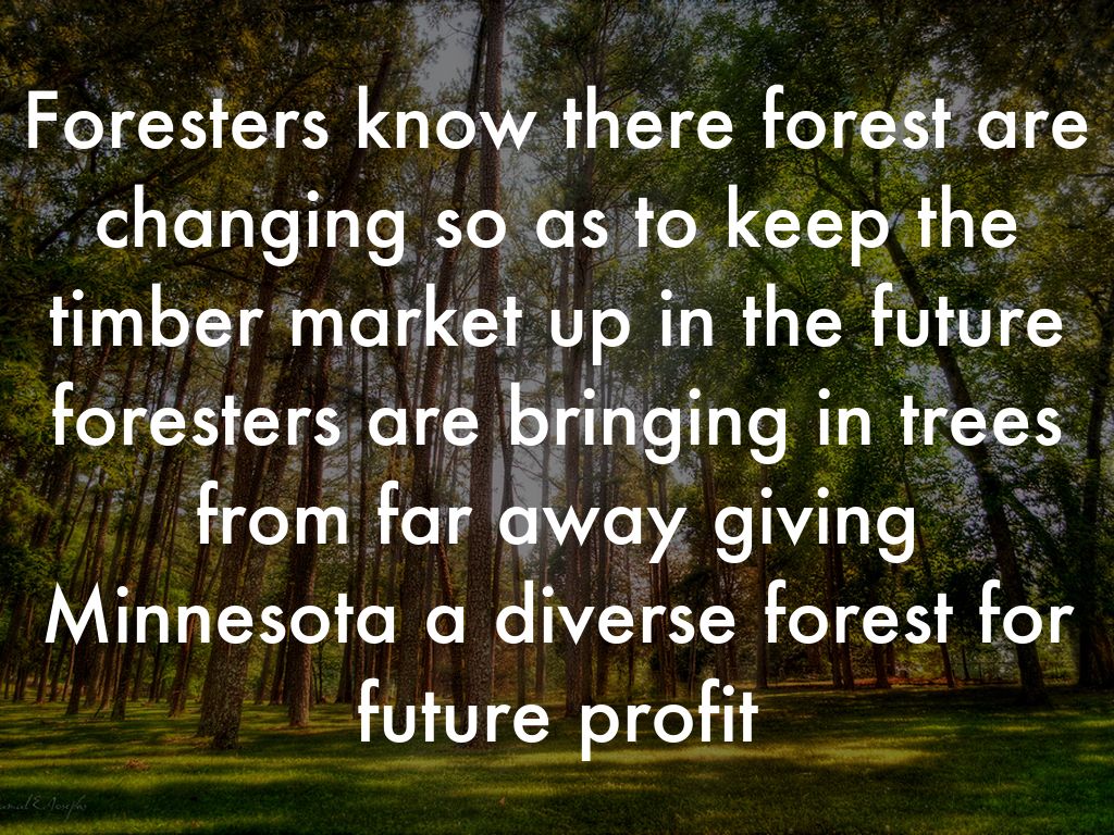 Foresters know there forest are changing so as to keep the timber market up in the future foresters are bringing in trees from far away giving Minnesota a diverse forest for future profit