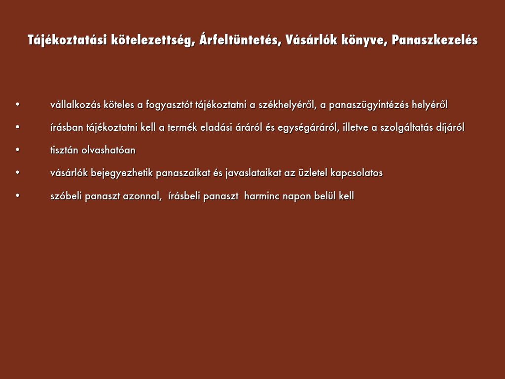 Tájékoztatási kötelezettség, Árfeltüntetés, Vásárlók könyve, Panaszkezelés