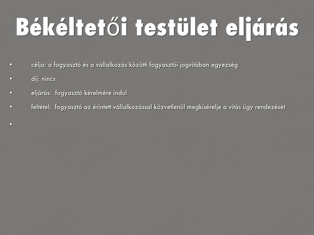 célja: a fogyasztó és a vállalkozás közötti fogyasztói jogvitában egyezség