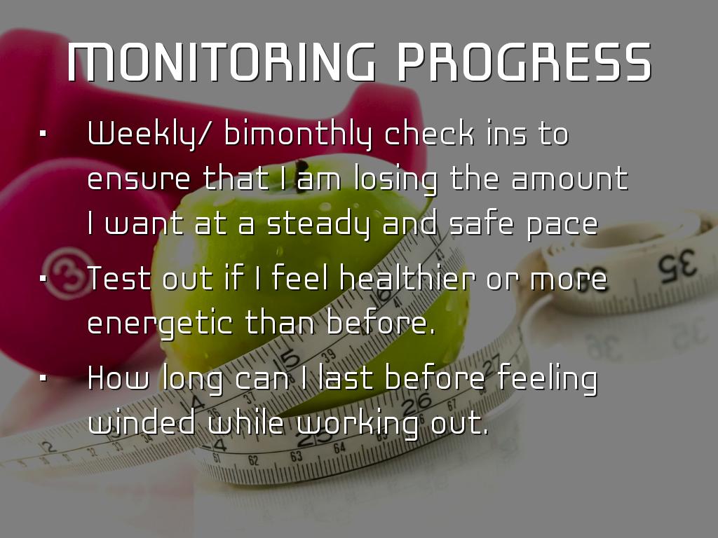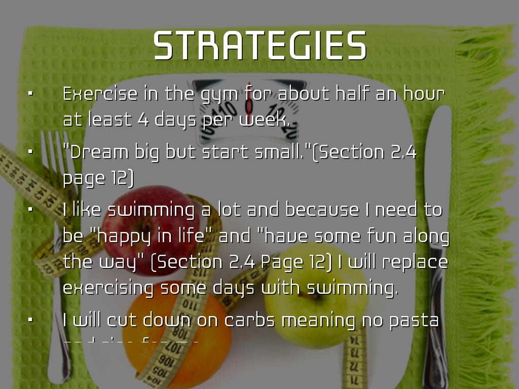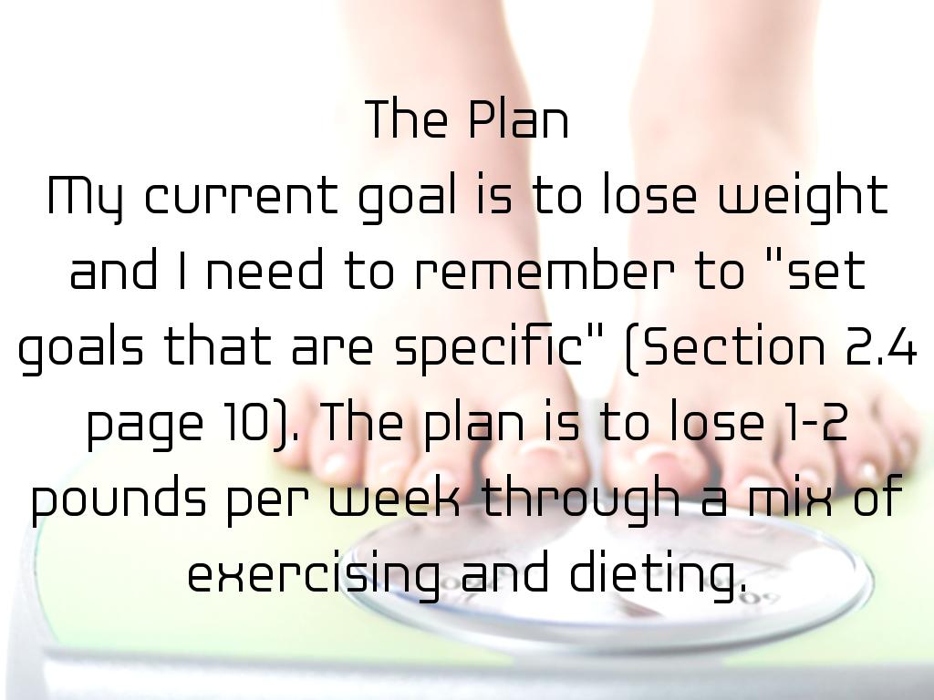The Plan My current goal is to lose weight and I need to remember to "set goals that are specific" (Section 2.4 page 10). The plan is to lose 1-2 pounds per week through a mix of exercising and dieting.