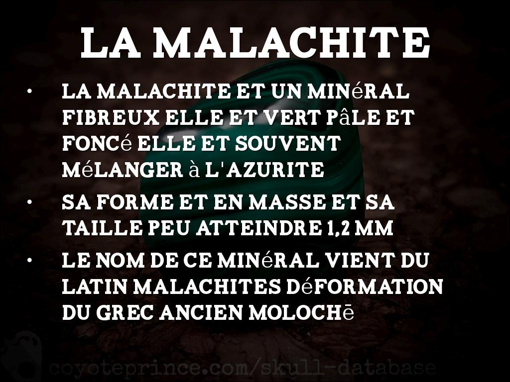 La malachite et un minéral fibreux elle et vert pâle et foncé elle et souvent mélanger à l'azurite