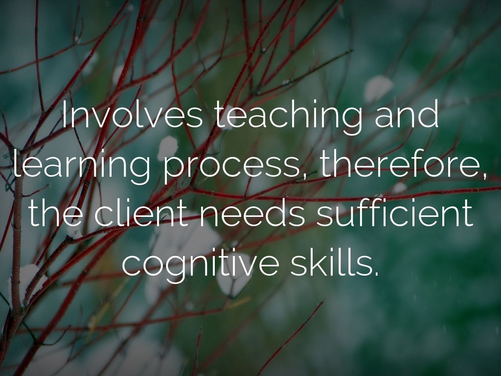 Involves teaching and learning process, therefore, the client needs sufficient cognitive skills.