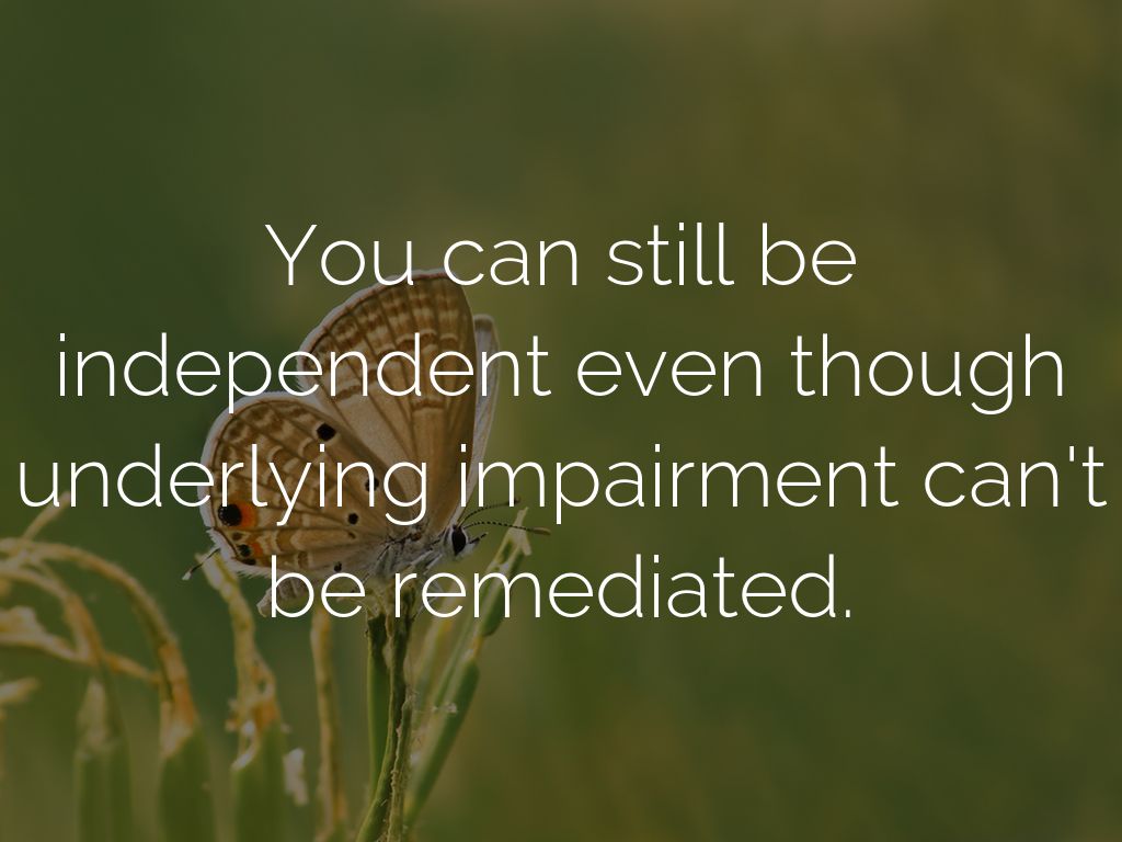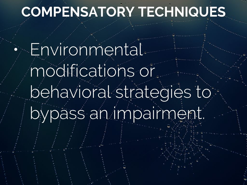 Environmental modifications or behavioral strategies to bypass an impairment.