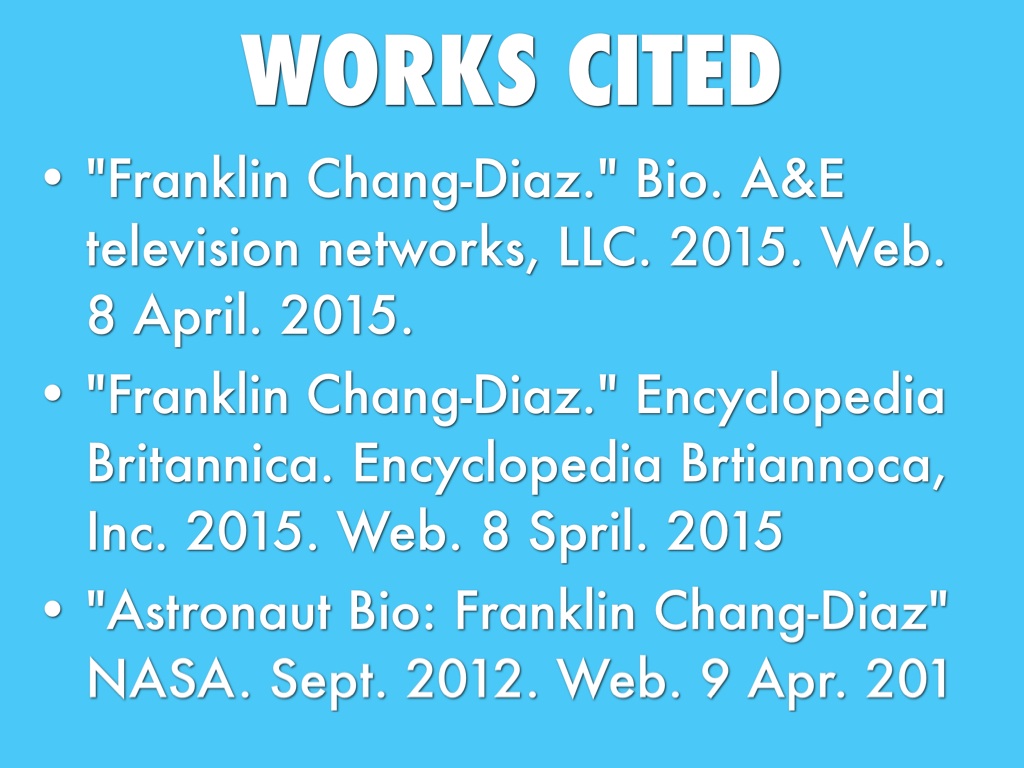 • "Franklin Chang-Diaz." Bio. A&E television networks, LLC. 2015. Web. 8 April. 2015.
