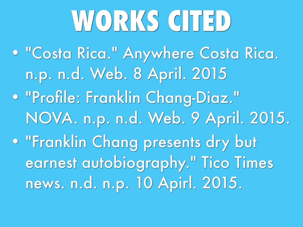 • "Profile: Franklin Chang-Diaz." NOVA. n.p. n.d. Web. 9 April. 2015.