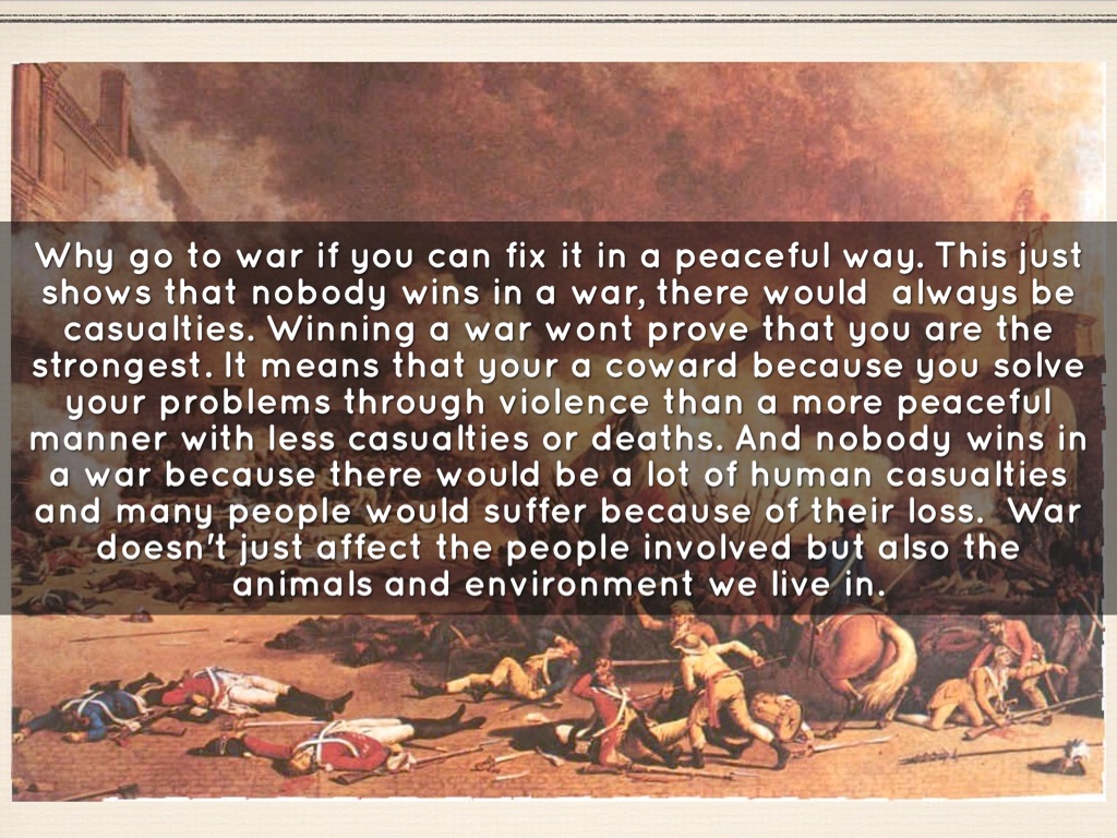 Why go to war if you can fix it in a peaceful way. This just shows that nobody wins in a war, there would always be casualties. Winning a war wont prove that you are the strongest. It means that your a coward because you solve your problems through violence than a more peaceful manner with less casualties or deaths. And nobody wins in a war because there would be a lot of human casualties and many people would suffer because of their loss. War doesn't just affect the people involved but also the animals and environment we live in.