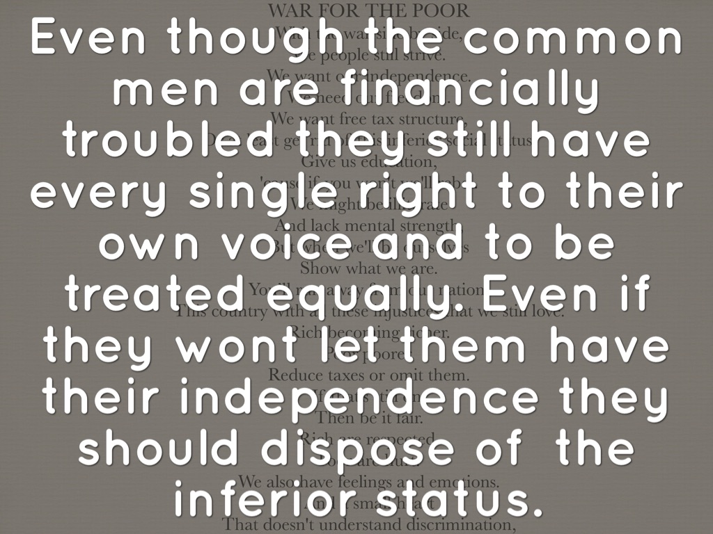 Even though the common men are financially troubled they still have every single right to their own voice and to be treated equally. Even if they wont let them have their independence they should dispose of the inferior status.