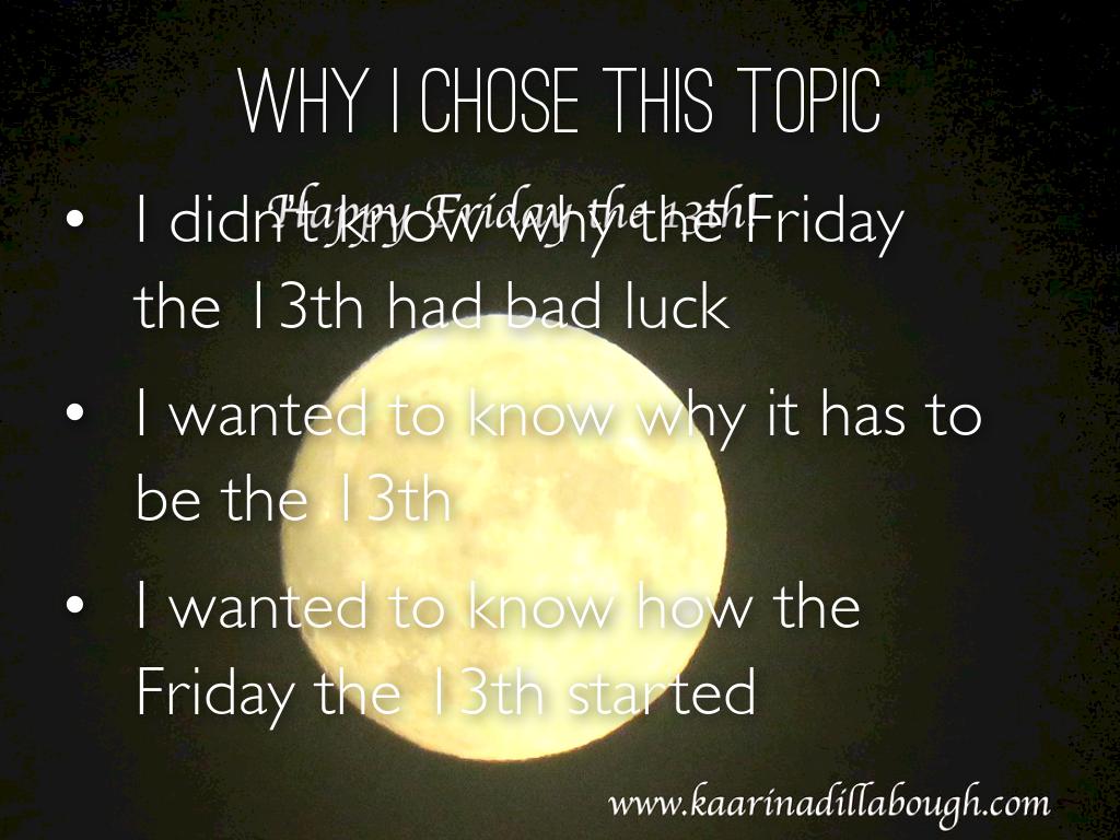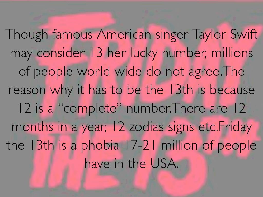 Though famous American singer Taylor Swift may consider 13 her lucky number, millions of people world wide do not agree.The reason why it has to be the 13th is because 12 is a “complete” number.There are 12 months in a year, 12 zodias signs etc.Friday the 13th is a phobia 17-21 million of people have in the USA.