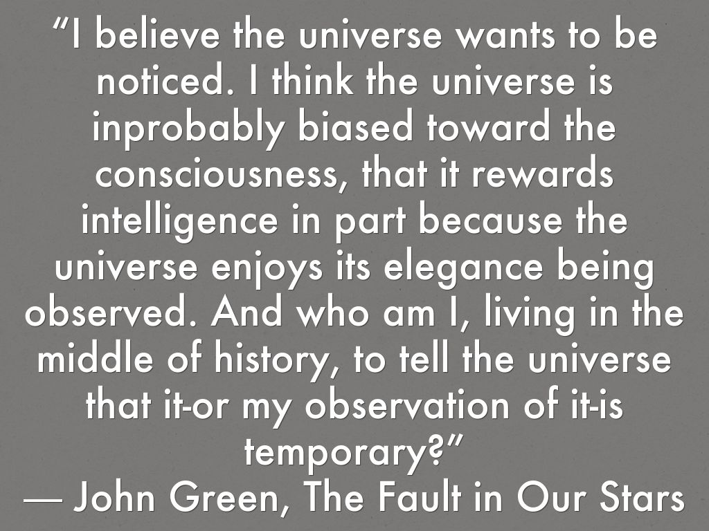 “I believe the universe wants to be noticed. I think the universe is inprobably biased toward the consciousness, that it rewards intelligence in part because the universe enjoys its elegance being observed. And who am I, living in the middle of history, to tell the universe that it-or my observation of it-is temporary?”