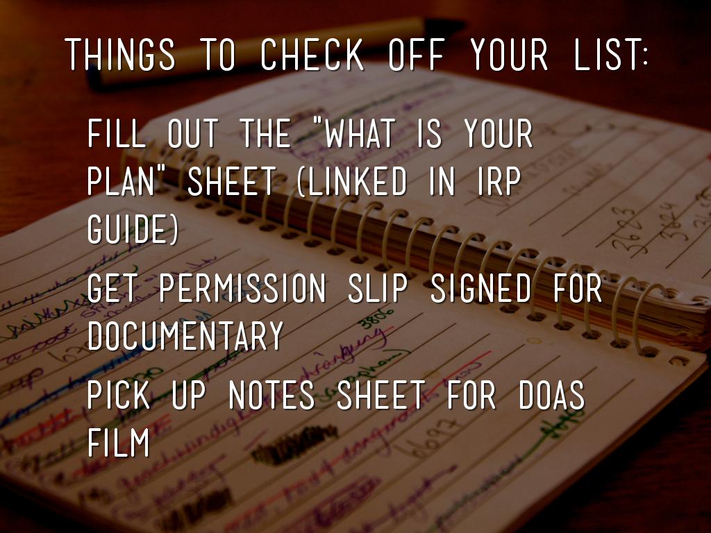 • Get permission slip signed for documentary