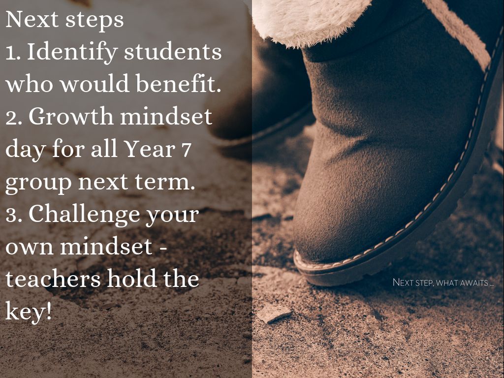 Next steps 1. Identify students who would benefit. 2. Growth mindset day for all Year 7 group next term. 3. Challenge your own mindset - teachers hold the key!