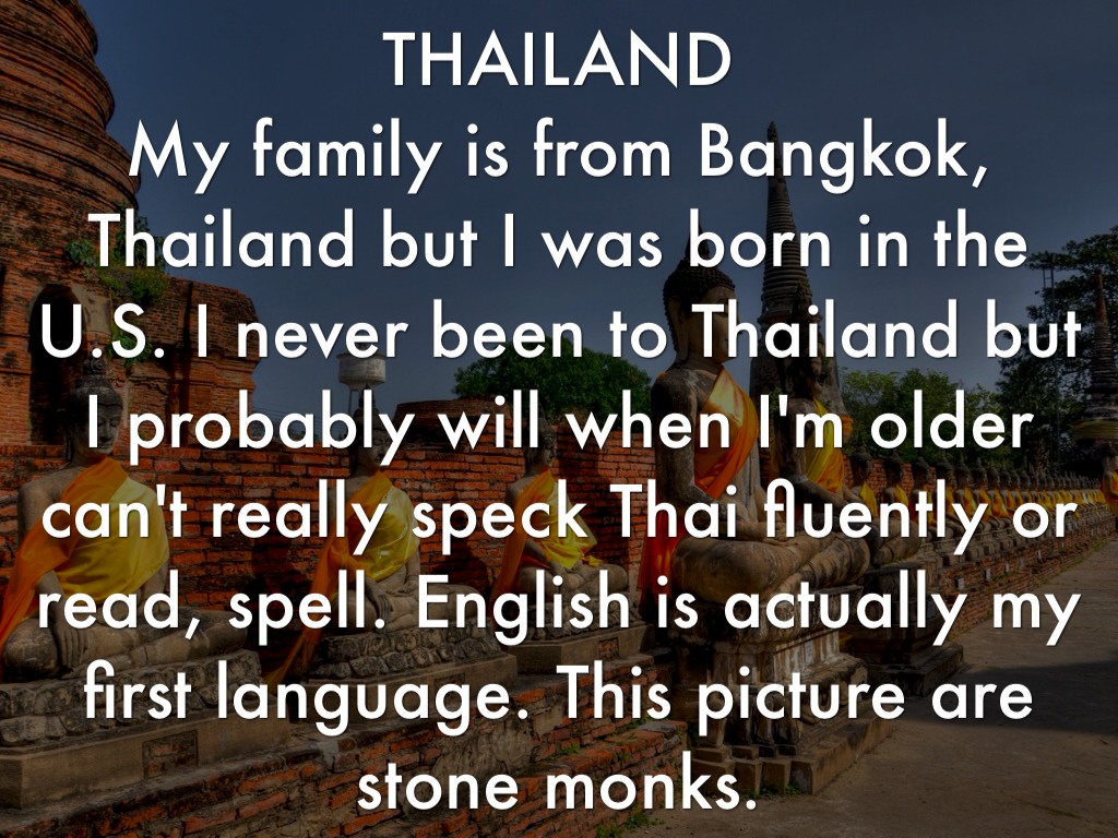THAILAND My family is from Bangkok, Thailand but I was born in the U.S. I never been to Thailand but I probably will when I'm older can't really speck Thai fluently or read, spell. English is actually my first language. This picture are stone monks.