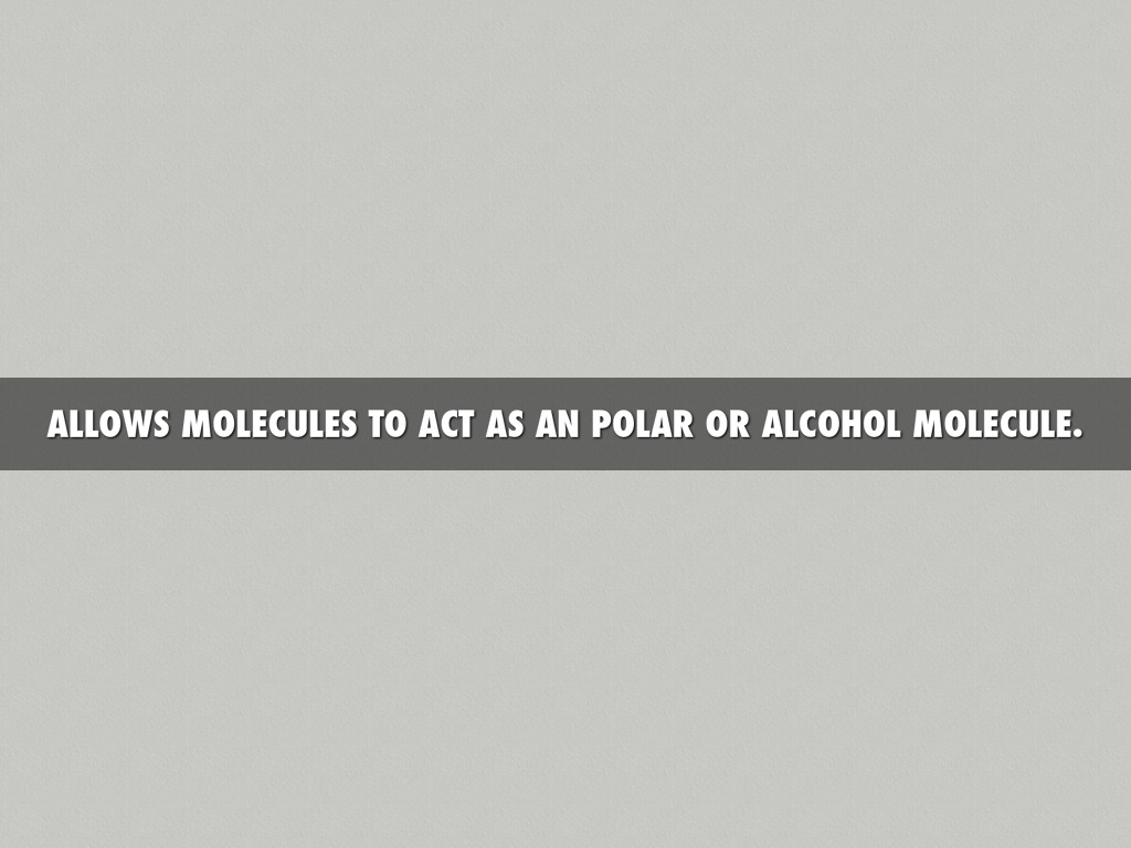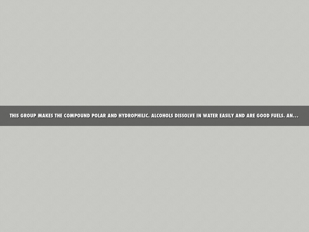 This group makes the compound polar and hydrophilic. Alcohols dissolve in water easily and are good fuels. An example of an alcohol is ethanol.