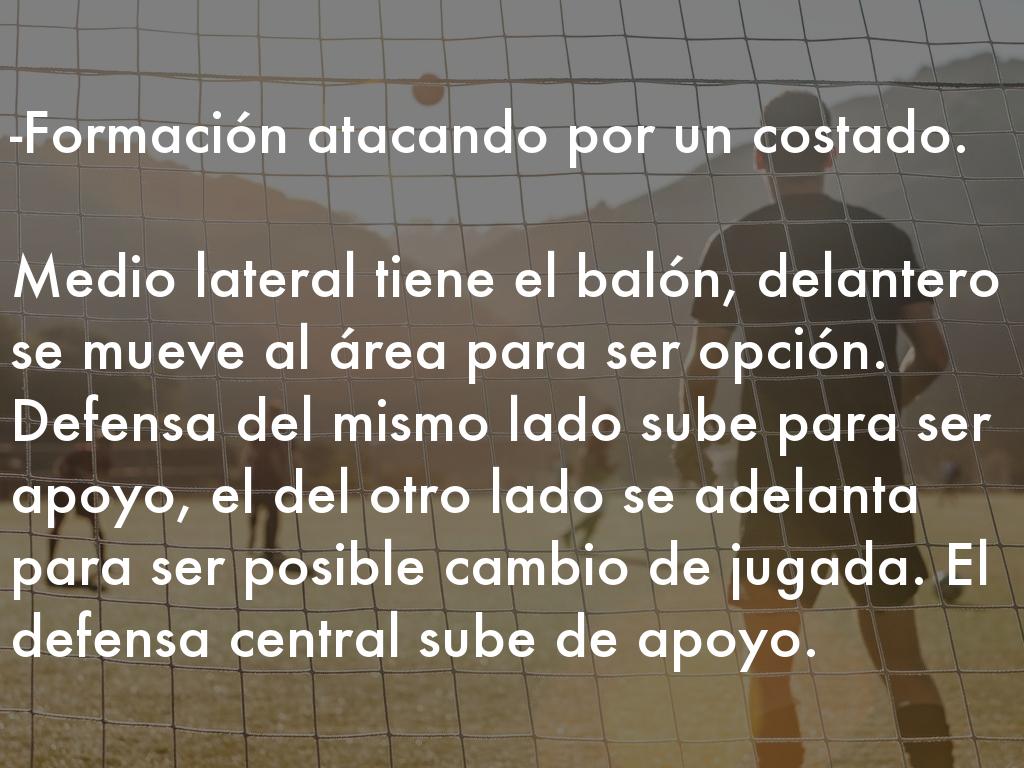 Medio lateral tiene el balón, delantero se mueve al área para ser opción. Defensa del mismo lado sube para ser apoyo, el del otro lado se adelanta para ser posible cambio de jugada. El defensa central sube de apoyo.