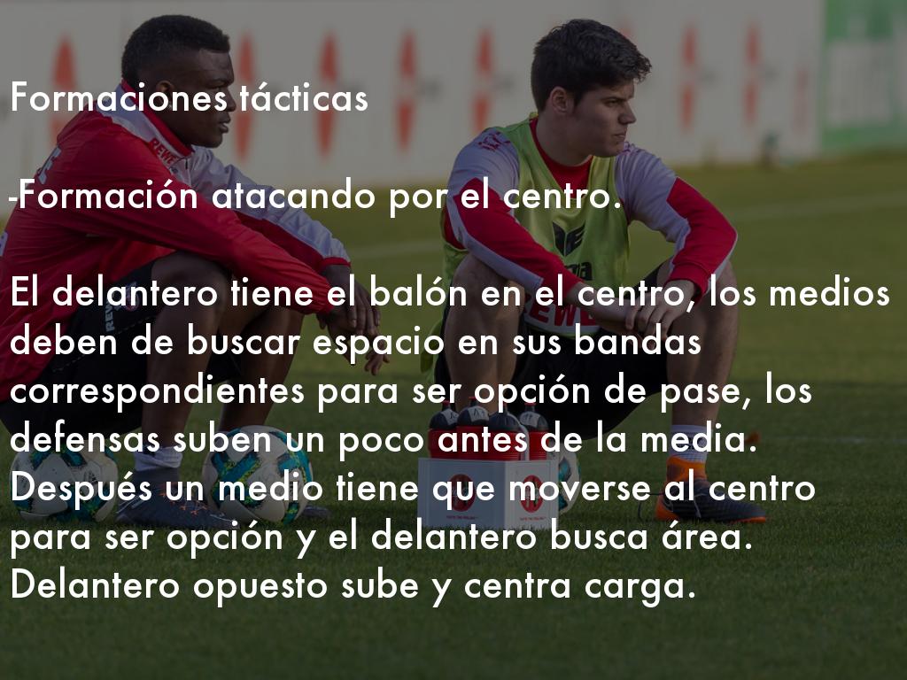 El delantero tiene el balón en el centro, los medios deben de buscar espacio en sus bandas correspondientes para ser opción de pase, los defensas suben un poco antes de la media. Después un medio tiene que moverse al centro para ser opción y el delantero busca área. Delantero opuesto sube y centra carga.