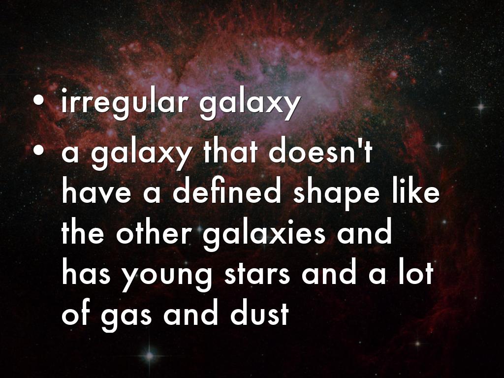 a galaxy that doesn't have a defined shape like the other galaxies and has young stars and a lot of gas and dust