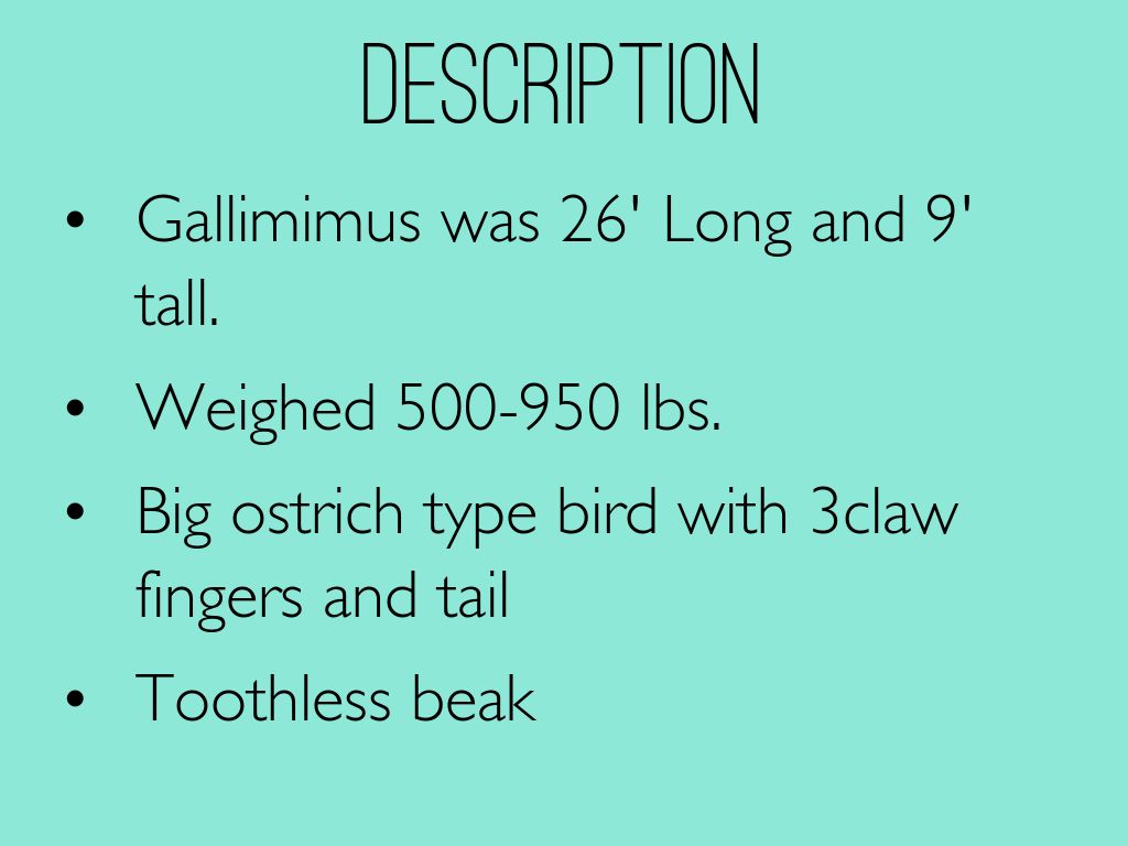 Gallimimus was 26' Long and 9' tall. Weighed 500-950 lbs. fast moving, bird like with toothless beak. Shorts arms with three fingers. The Gallimimus has a toothless beak so like a snake he swallowed it whole.