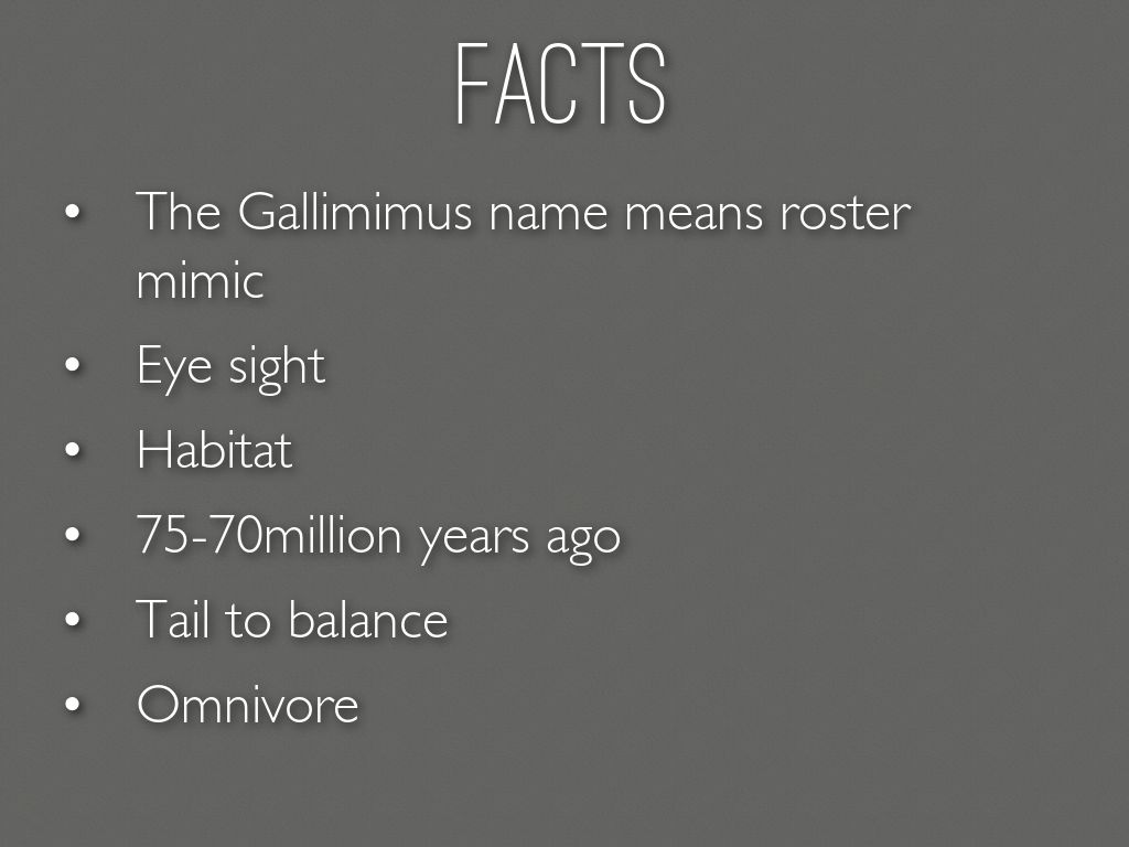 The Gallimimus name means roster mimic. EyeSight had eyes that faced out this Evans that the Gallimimus had a very wide view. There habitat was in Mongolia. They lived in Jurassic period in Mesozoic era 75-70 million years ago