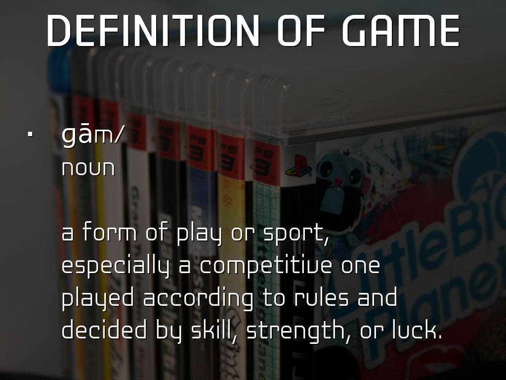 ɡām/ noun a form of play or sport, especially a competitive one played according to rules and decided by skill, strength, or luck.