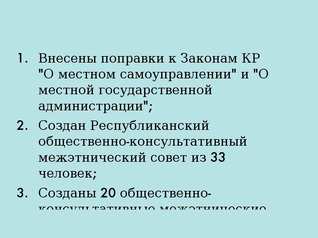 - Внесены поправки к Законам КР "О местном самоуправлении" и "О местной государственной администрации";