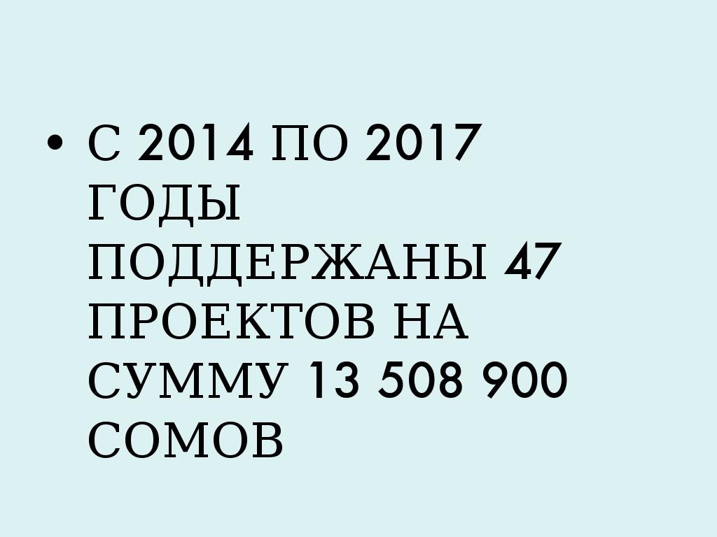 - С 2014 ПО 2017 ГОДЫ ПОДДЕРЖАНЫ 47 ПРОЕКТОВ НА СУММУ 13 508 900 СОМОВ
